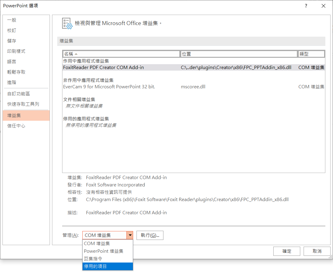 2. 點選「關於 Microsoft Office PowerPoint > 停用的項目」中把狀態換成 "啟用" 即可