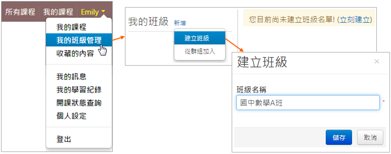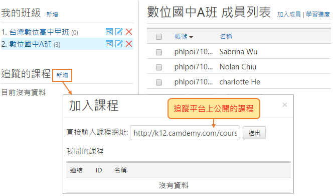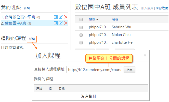您可以建立班級,邀請同學進入班級,並將他們加入課程,就能夠去追蹤學生在該堂課的學習歷程。