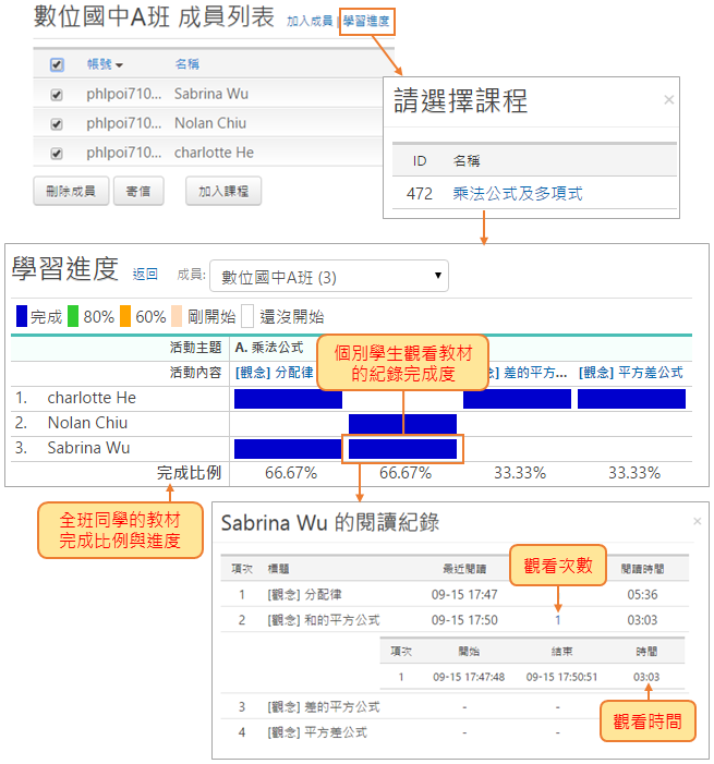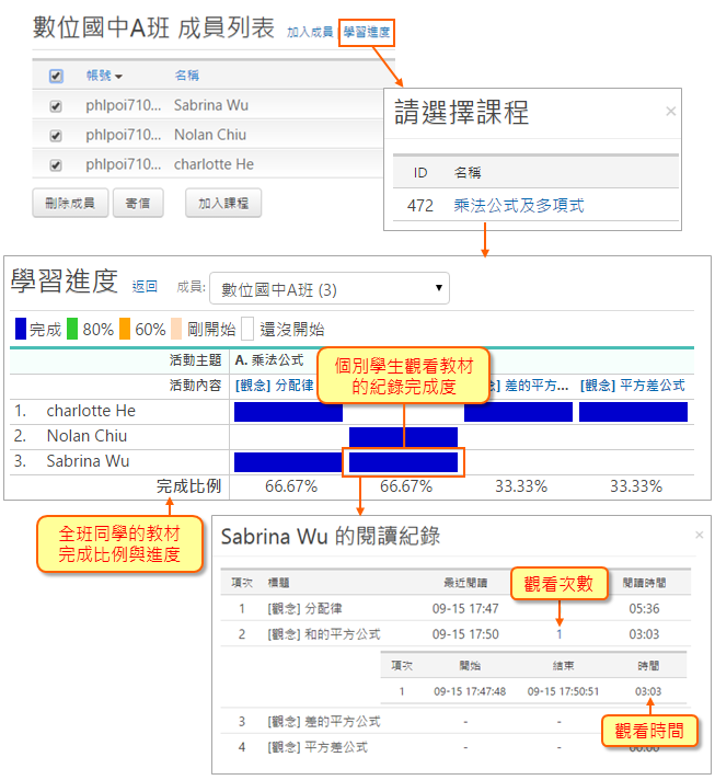 點擊「學習進度」,選擇課程,就可以看到系統提供的報表,觀看班上每位同學的學習歷程。