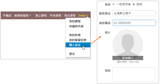 首先,請先在 k12.camdemy.com 建立帳號,在「使用者下拉選單 > 個人設定」,將角色切換為教師,
