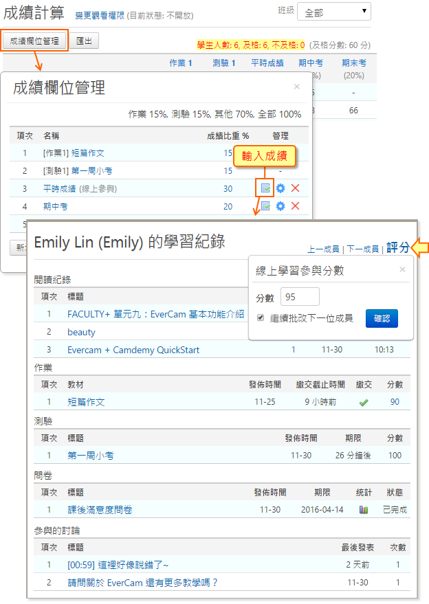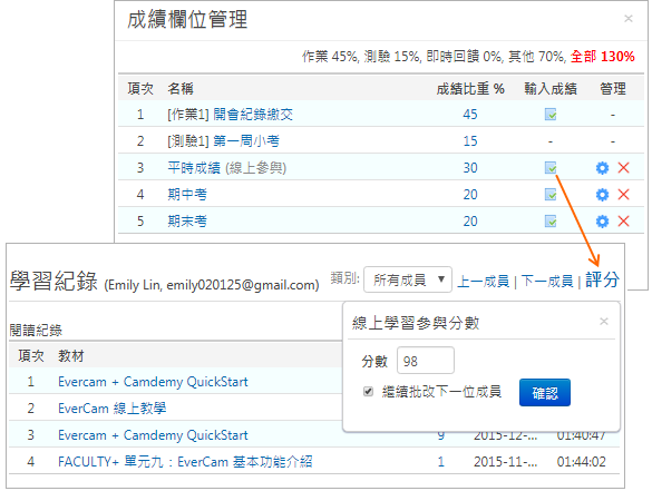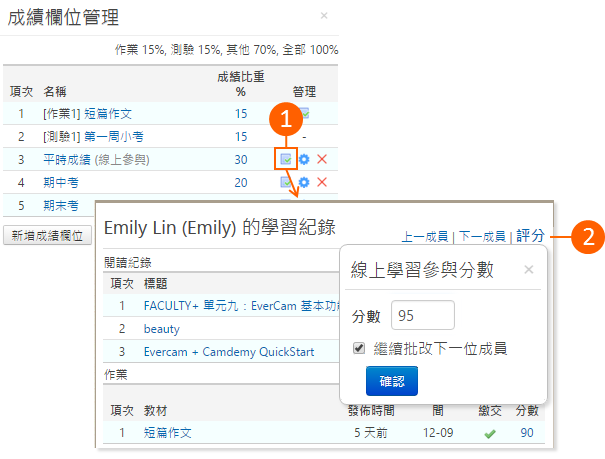 除了針對教室的表現評分 (如專題報告、出席率),老師也可以針對學生在線上的參與程度打分數,
