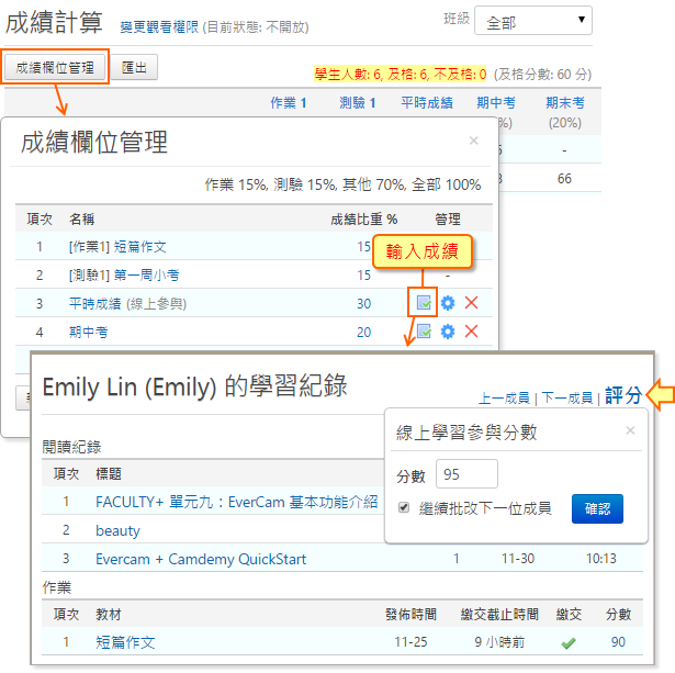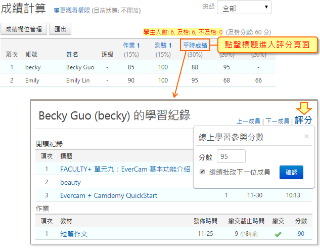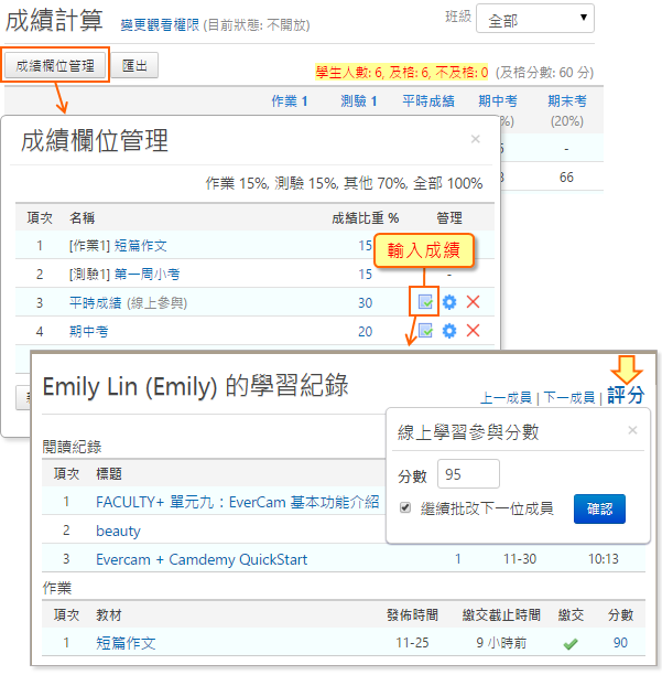 進入「成績欄位管裡 > 輸入成績」,老師即可透過瀏覽學生的學習記錄,來進行評分。