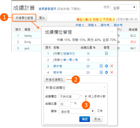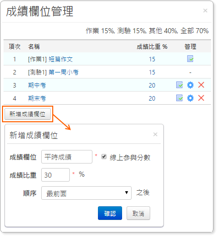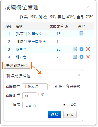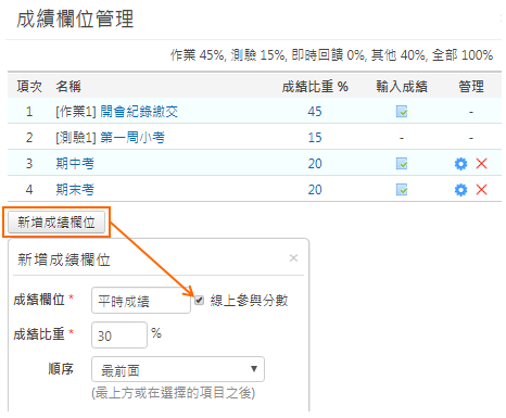 點擊「新增成績欄位」,輸入名稱及比重,並勾選「線上參與分數」,按下確認即可。