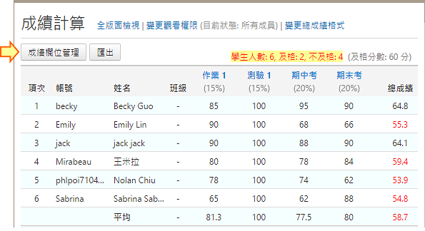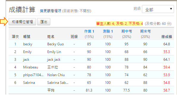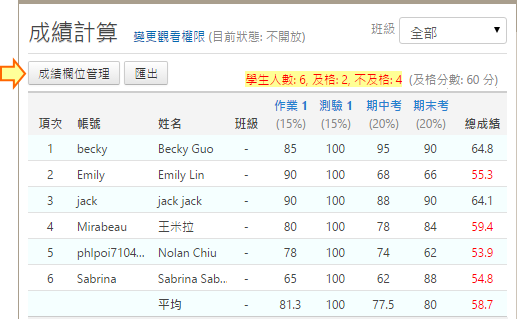 在「成績計算」點選「成績欄位管理」進入管理視窗。
