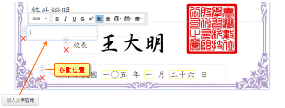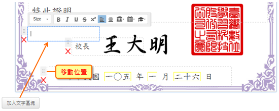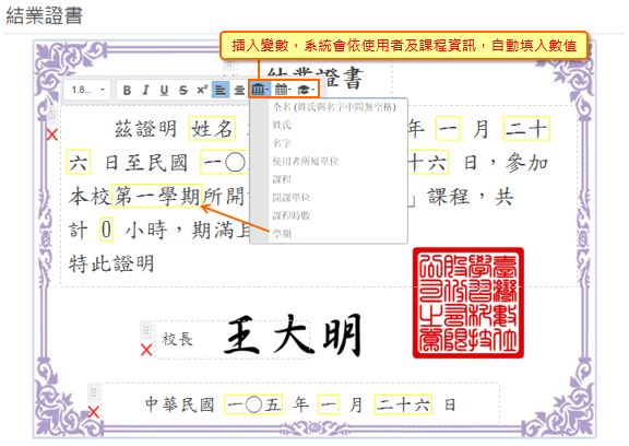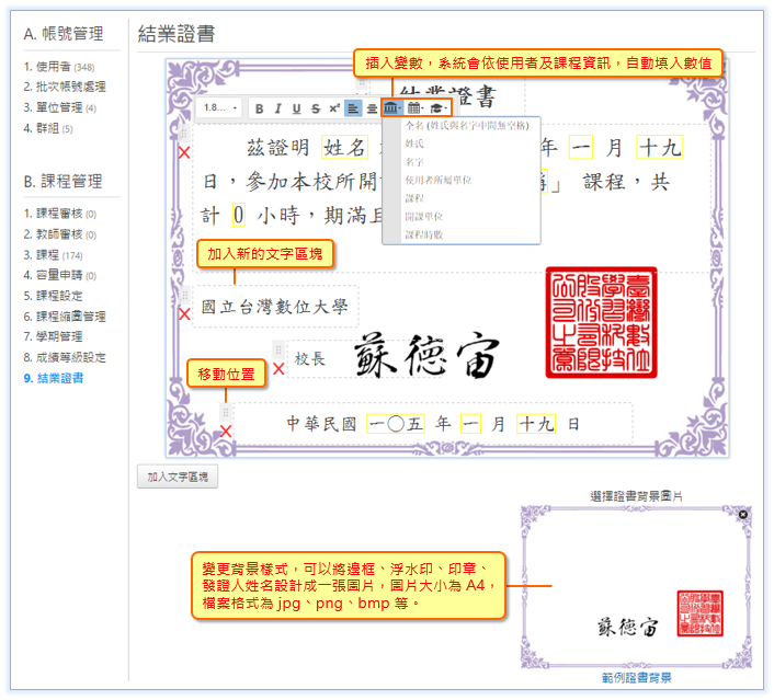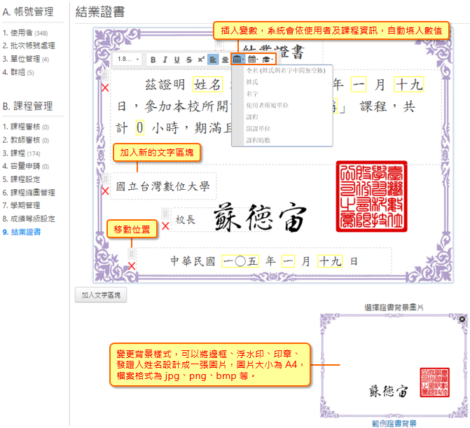證書預設的樣式及內容建議由系統管理者先行設計,以方便課程老師直接使用或微調。