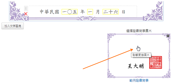 證書的背景樣式可以將邊框、浮水印、印章、發證人姓名設計成一張圖片,