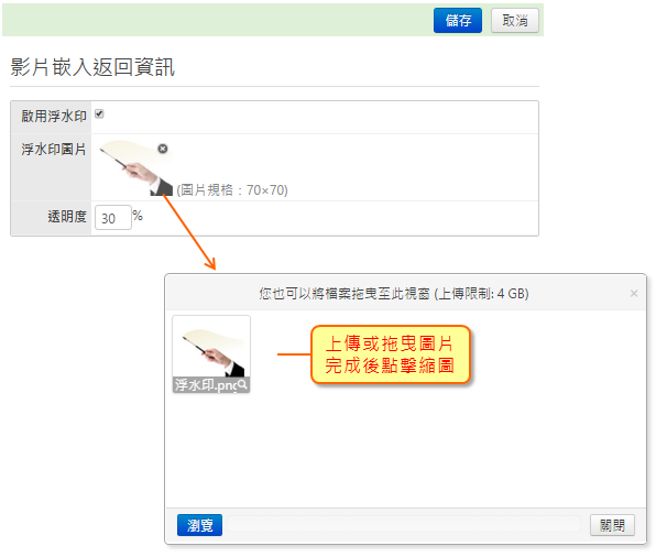 上傳浮水印圖片並設定「透明度」後,將「啟用」勾選,點擊「儲存」即可。
