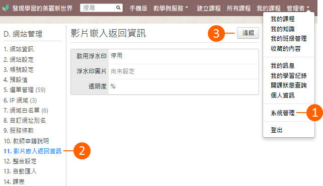以系統管理者身分進入「系統管理」後,點選側欄「網站管理 > 影片嵌入返回資訊 > 編輯」進入編輯頁面。