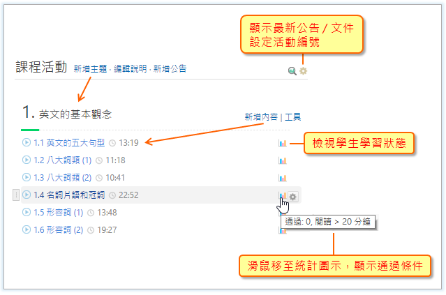 課程活動是 ee-class 課程的主要頁面,由許多「主題」所構成,主題內則可以安排不同的學習內容,每個學習內容還可以設定完成的時間與通過條件。