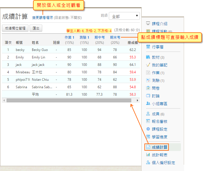 助教被老師加入課程後,就可以協助老師建立教學內容、出作業、發公告、登記成績、....