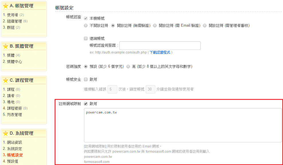 請於「系統 / C. 系統管理 / 3. 帳號設定 / 編輯」,勾選 「註冊網域限制」以開啟此功能,並參考此功能下方的說明,輸入欲限制的 Email 網域,並按下儲存即完成。