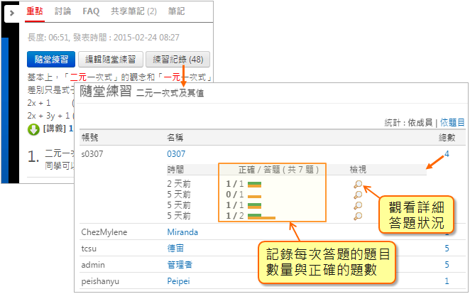 1. 個別學生的練習過程,以便提供進一步的輔導或協助 (如下圖 A)