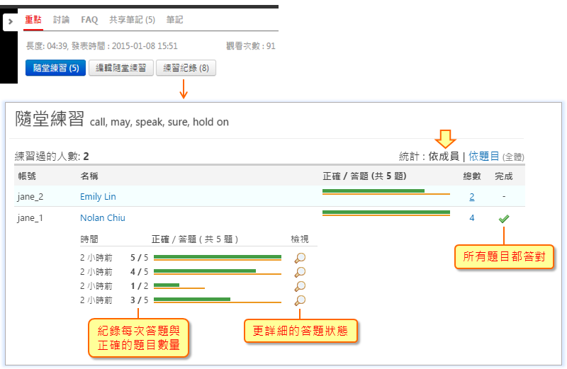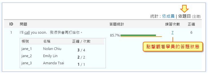 進入課程後,點擊側欄的「練習紀錄」,就可以看到系統提供的報表,來觀看學生的練習歷程,例如: