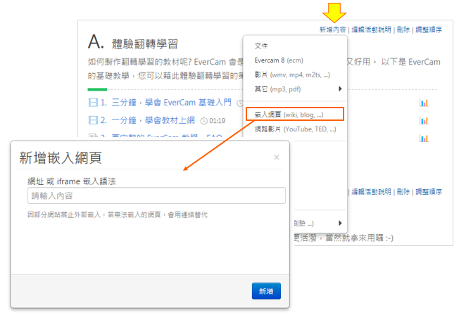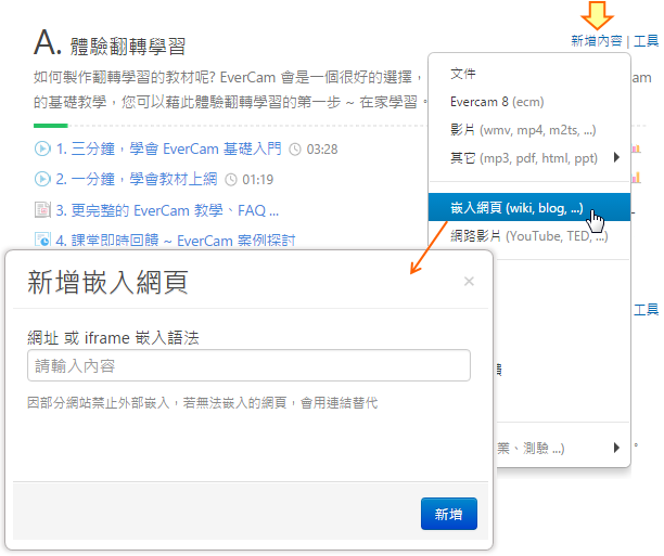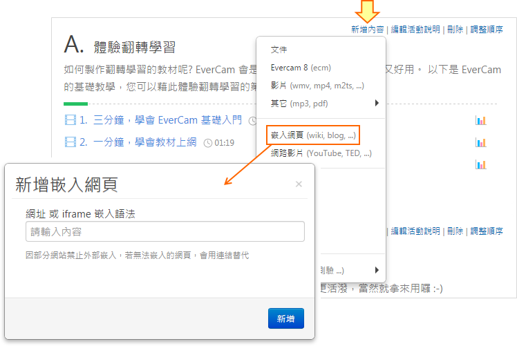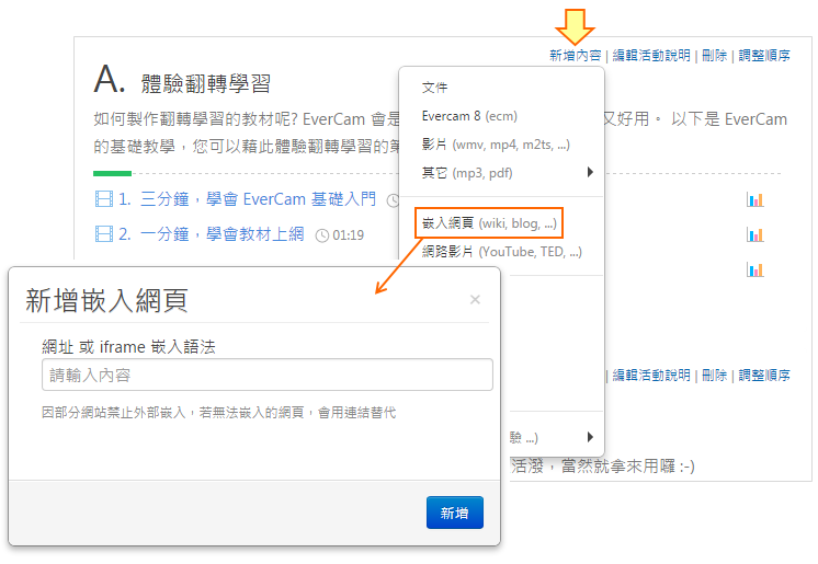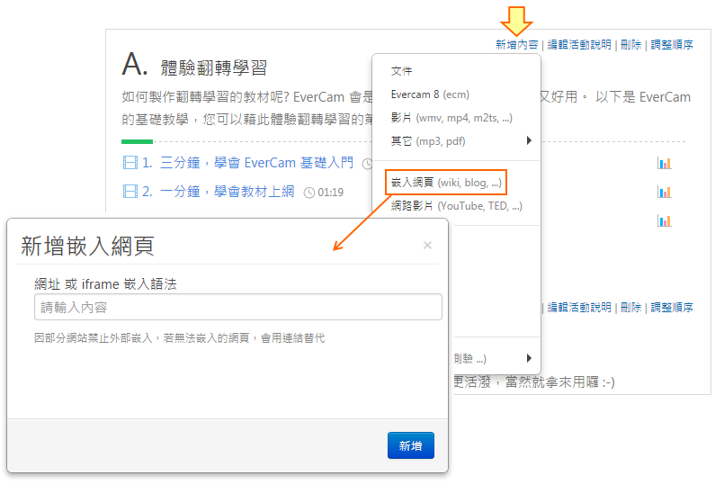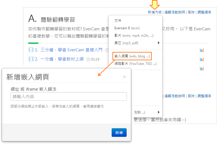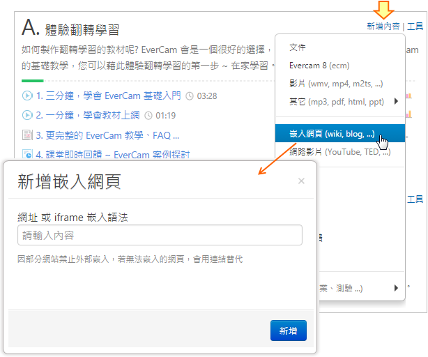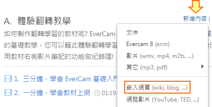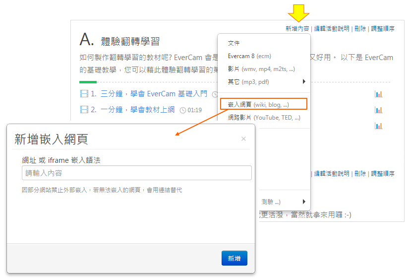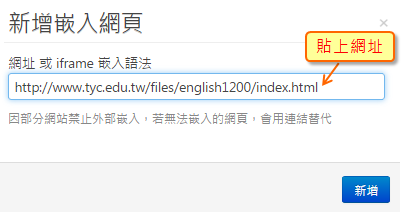 在課程活動中,點選「新增內容 > 嵌入網頁」